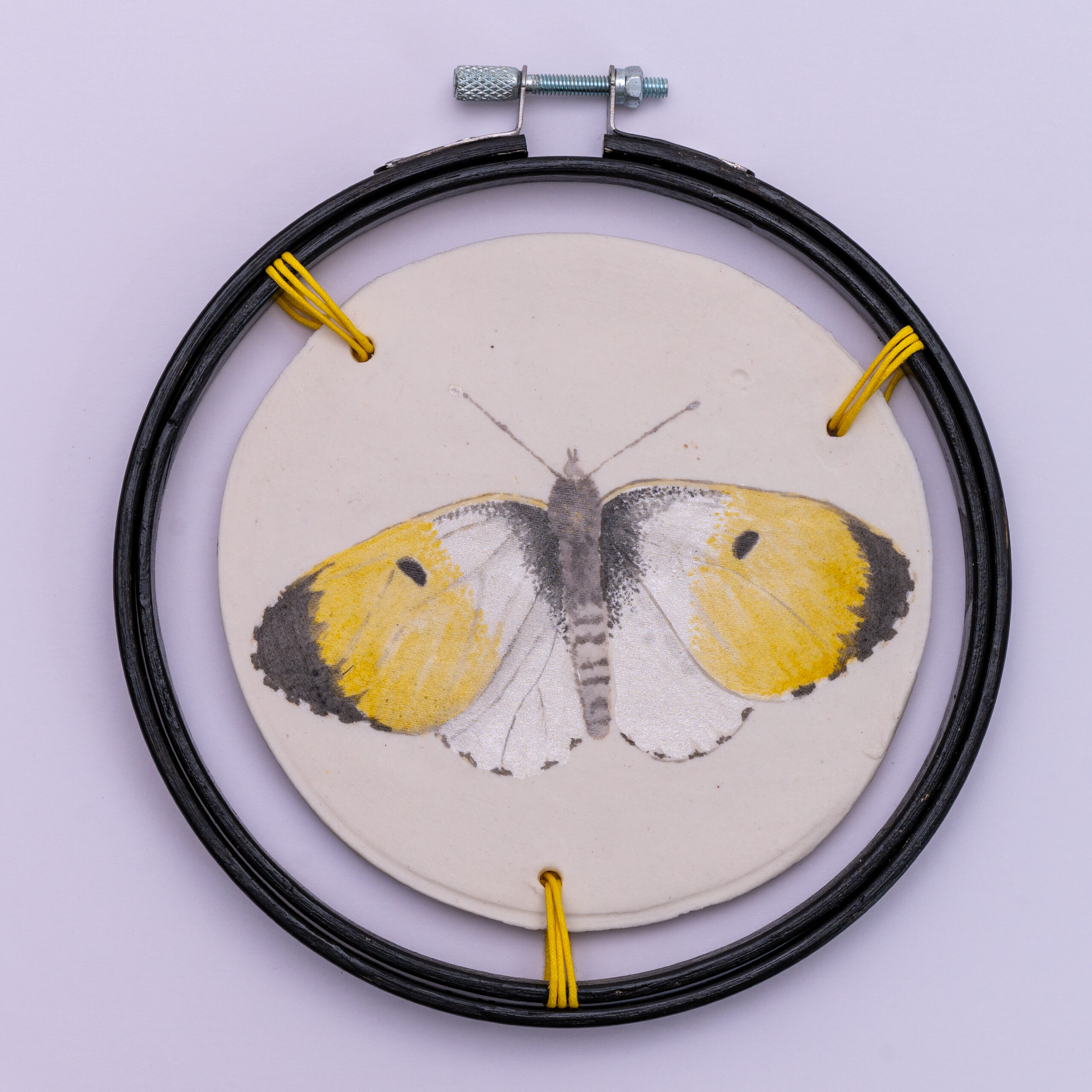 Ronde vorm van porselein, de vlinder is beschilderd met aquarelachtige verf in geeltinten en gestookt. Ingelijst in zwarte ringen met gekleurd waxdraad. Eenvoudig aan de wand te bevestigen en bijzonder in hun subtiele uitstraling.