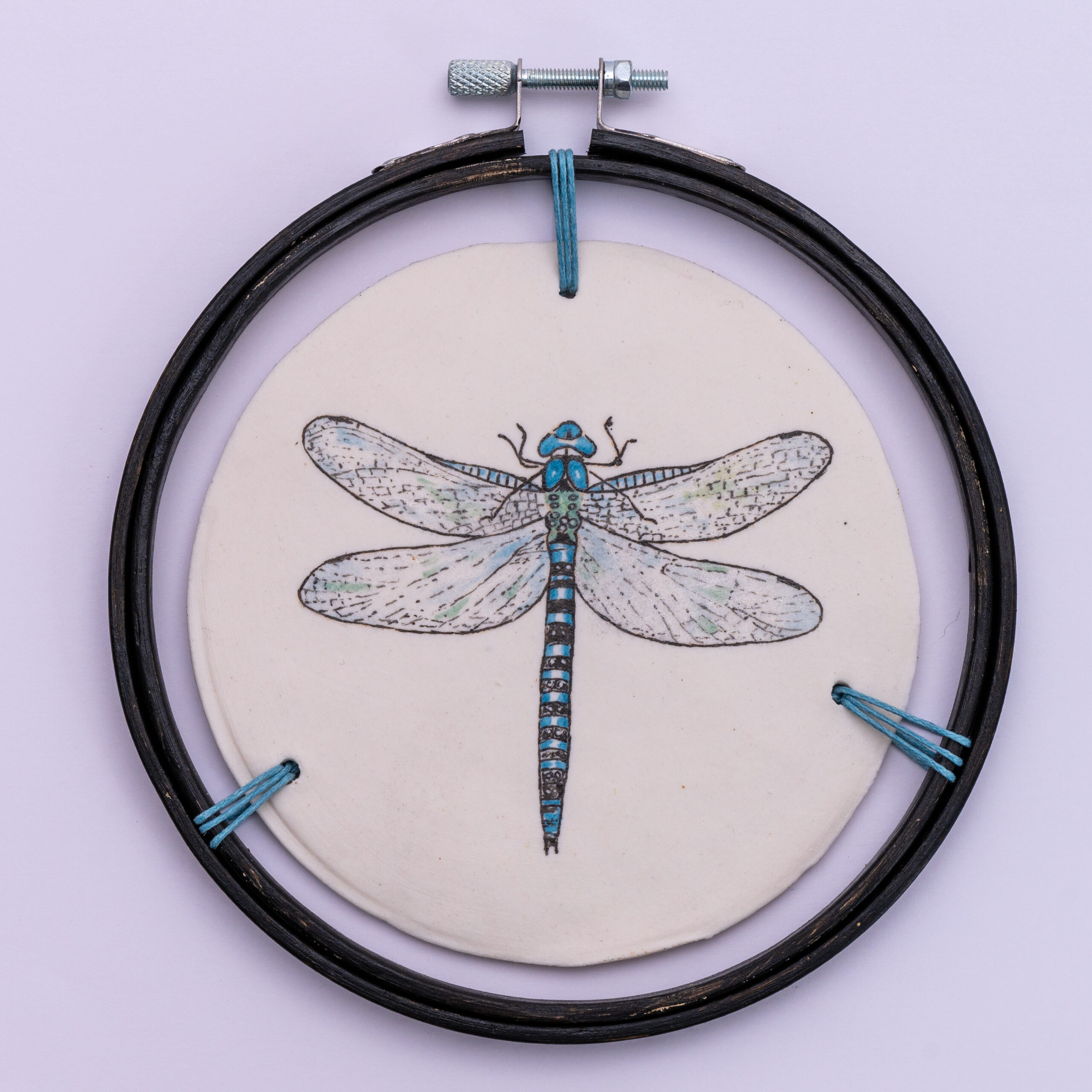Ronde vorm is van porselein, de libelle is beschilderd met een aquarelachtige verf in blauwtinten en gestookt. Ingelijst in zwarte ringen met gekleurd waxdraad. Eenvoudig aan de wand te bevestigen en bijzonder in hun subtiele uitstraling.