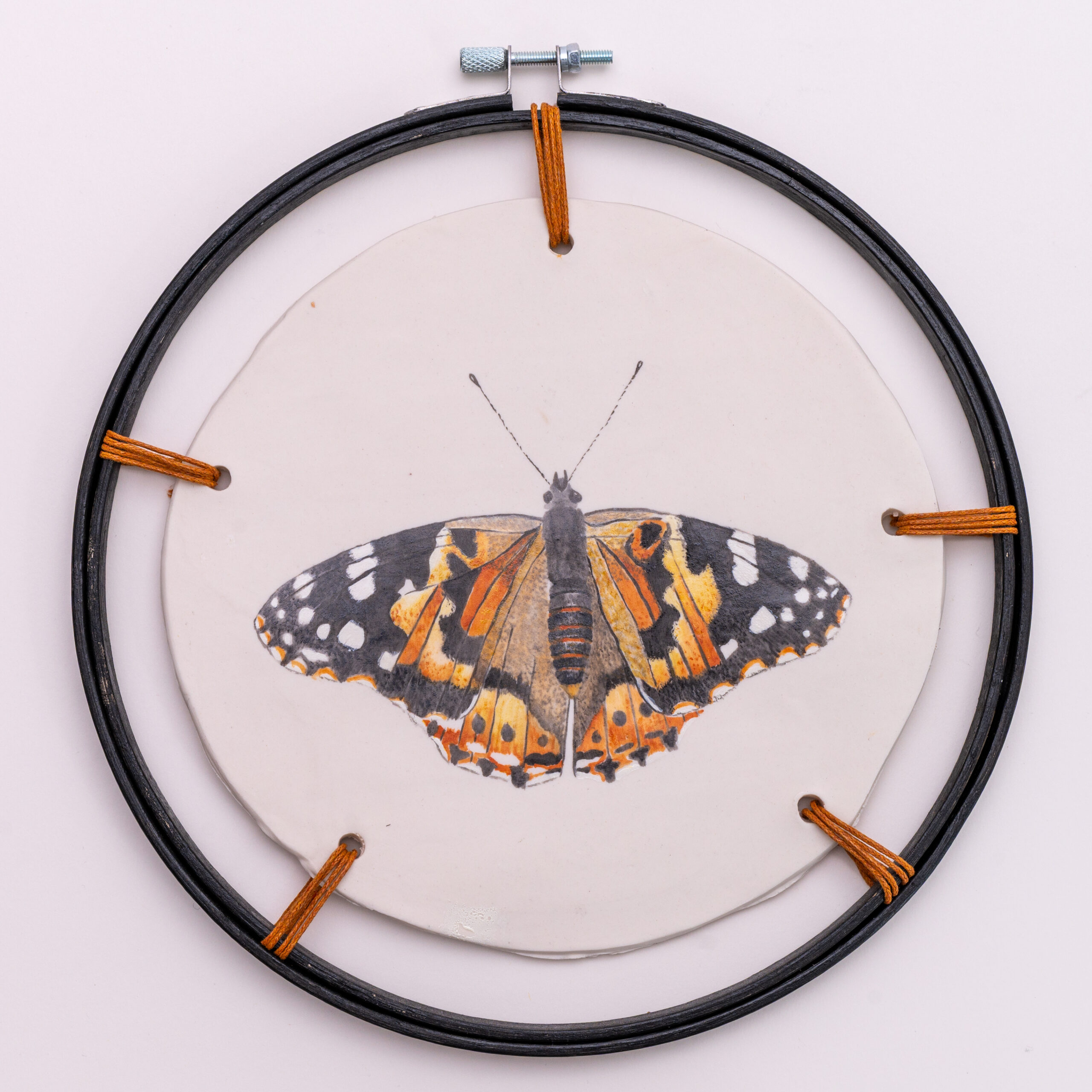 Ronde vorm is van porselein en de vlinder is beschilderd met een aquarelachtige verf in oranje/bruintinten en gestookt. Ingelijst in zwarte ringen met gekleurd waxdraad. Eenvoudig aan de wand te bevestigen en bijzonder in hun subtiele uitstraling.